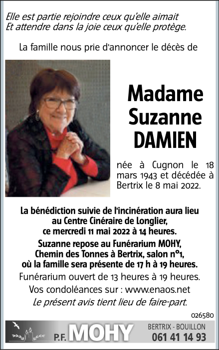 Décédée à Bertrix (6880) le dimanche 8 mai 2022 à l'âge de 79 ans