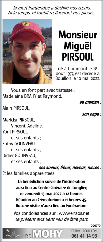 Décédé à Bouillon (6830) le mardi 10 mai 2022 à l'âge de 44 ans