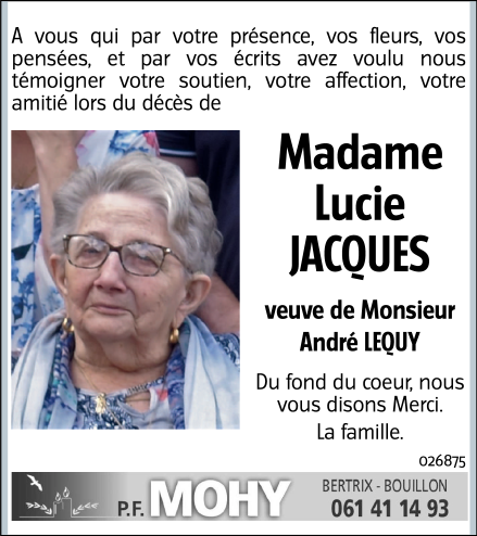 Décédée à Bouillon (6830) le samedi 30 avril 2022 à l'âge de 90 ans