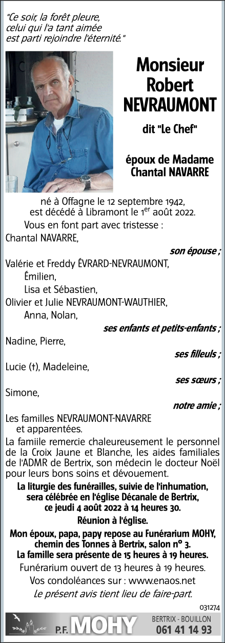 Décédé à Libramont (6800) le lundi 1 août 2022 à l'âge de 79 ans