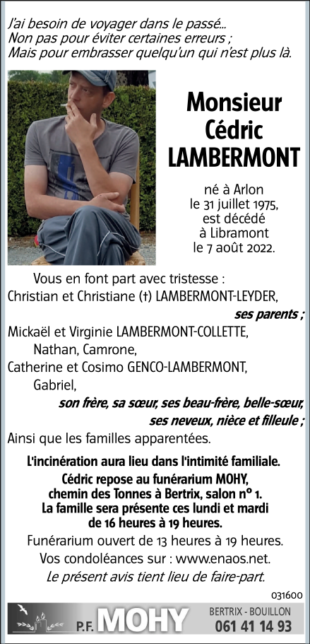 Décédé à Libramont (6800) le dimanche 7 août 2022 à l'âge de 47 ans