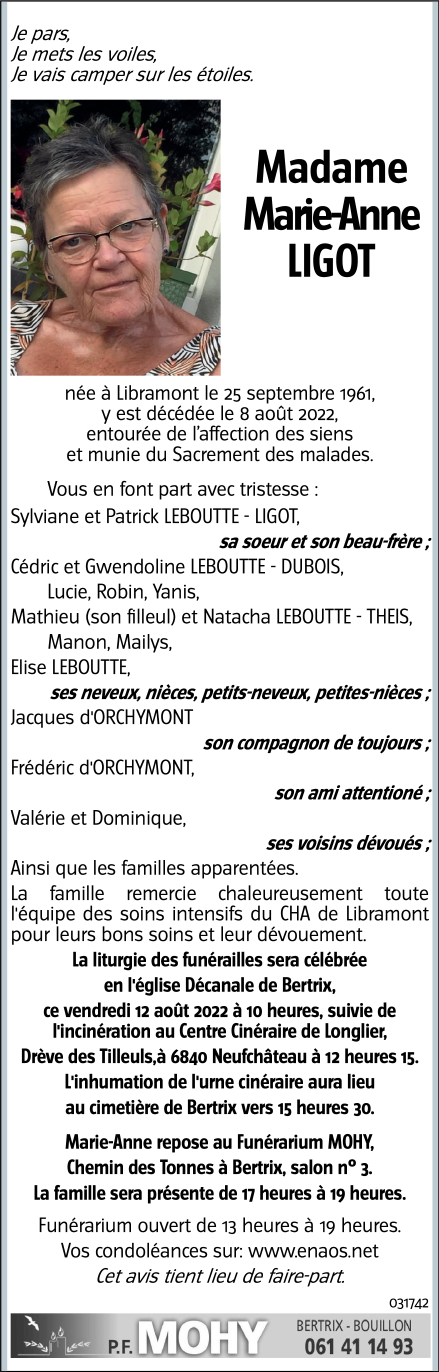Décédée à Libramont (6800) le lundi 8 août 2022 à l'âge de 60 ans