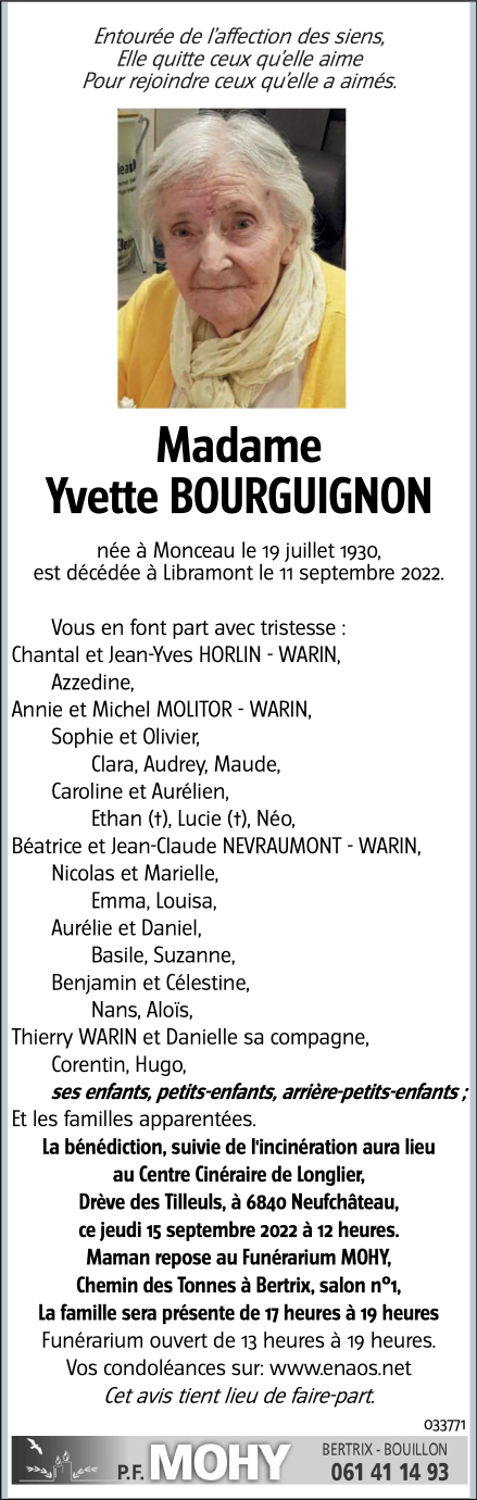 Décédée à Libramont (6800) le dimanche 11 septembre 2022 à l'âge de 92 ans