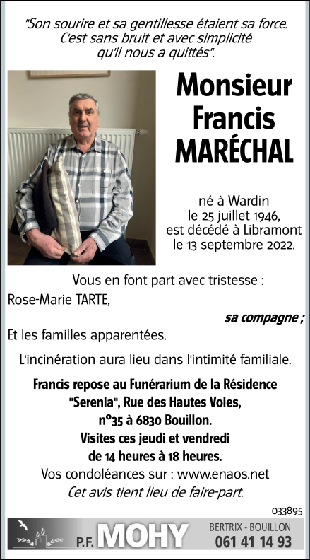 Décédé à Libramont (6800) le mercredi 14 septembre 2022 à l'âge de 76 ans