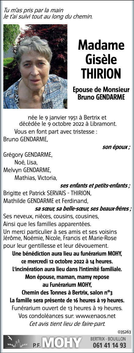 Décédée à Libramont (6800) le dimanche 9 octobre 2022 à l'âge de 71 ans