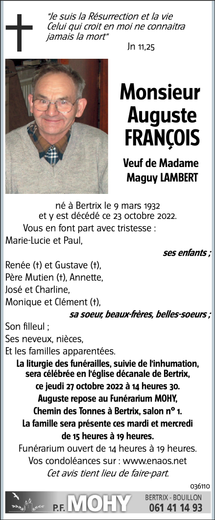 Décédé à Bertrix (6880) le dimanche 23 octobre 2022 à l'âge de 90 ans