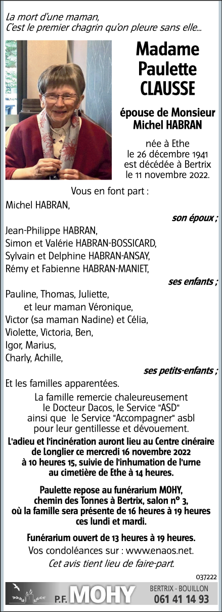 Décédée à Bertrix (6880) le vendredi 11 novembre 2022 à l'âge de 80 ans