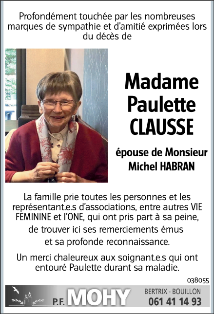 Décédée à Bertrix (6880) le vendredi 11 novembre 2022 à l'âge de 80 ans