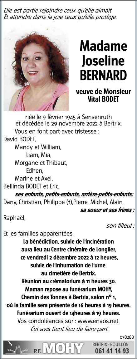 Décédée à Bertrix (6880) le lundi 28 novembre 2022 à l'âge de 77 ans