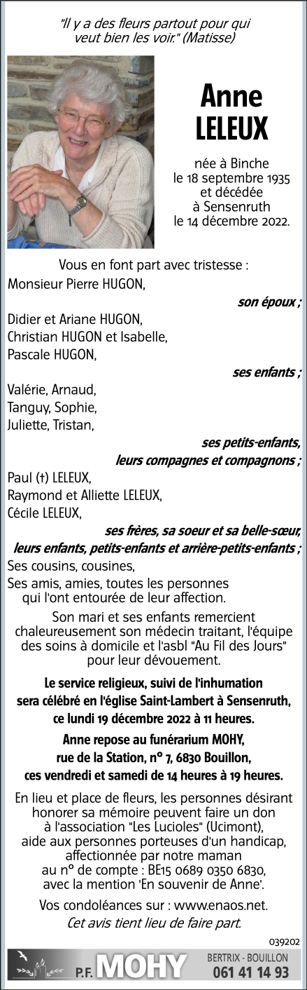 Décédée à Sensenruth (6832) le mercredi 14 décembre 2022 à l'âge de 87 ans