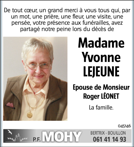 Décédée à Bertrix (6880) le jeudi 23 février 2023 à l'âge de 86 ans
