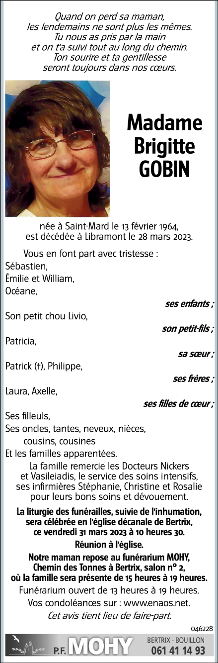 Décédée à Libramont (6800) le mardi 28 mars 2023 à l'âge de 59 ans