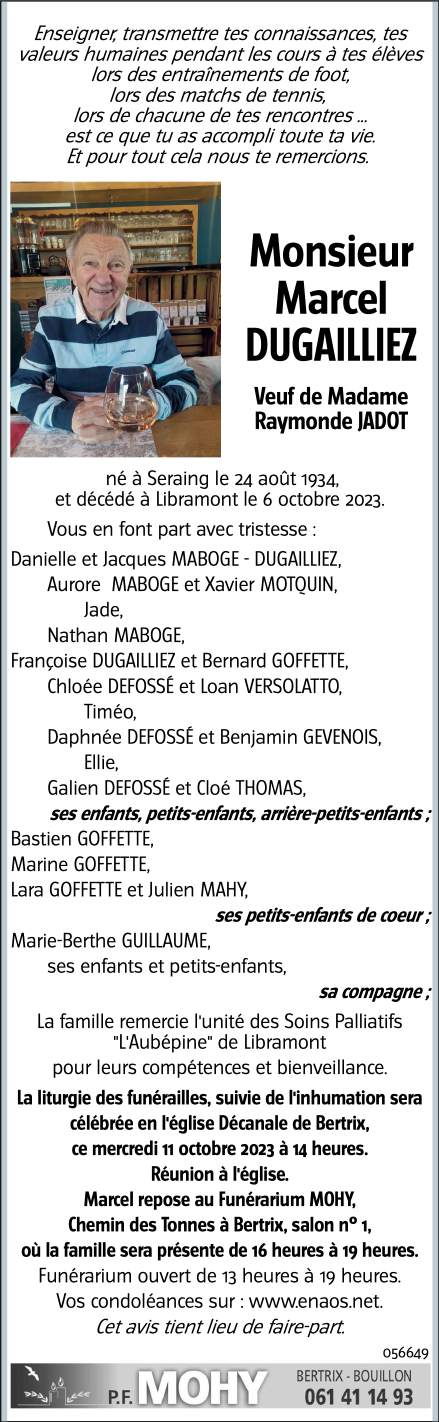Décédé à Libramont (6800) le vendredi 6 octobre 2023 à l'âge de 89 ans