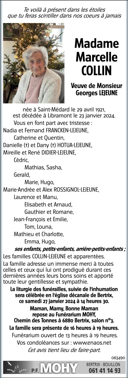 Décédée à Libramont (6800) le mardi 23 janvier 2024 à l'âge de 102 ans