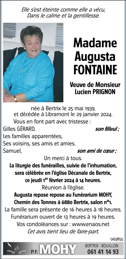 Décédée à Libramont (6800) le lundi 29 janvier 2024 à l'âge de 84 ans