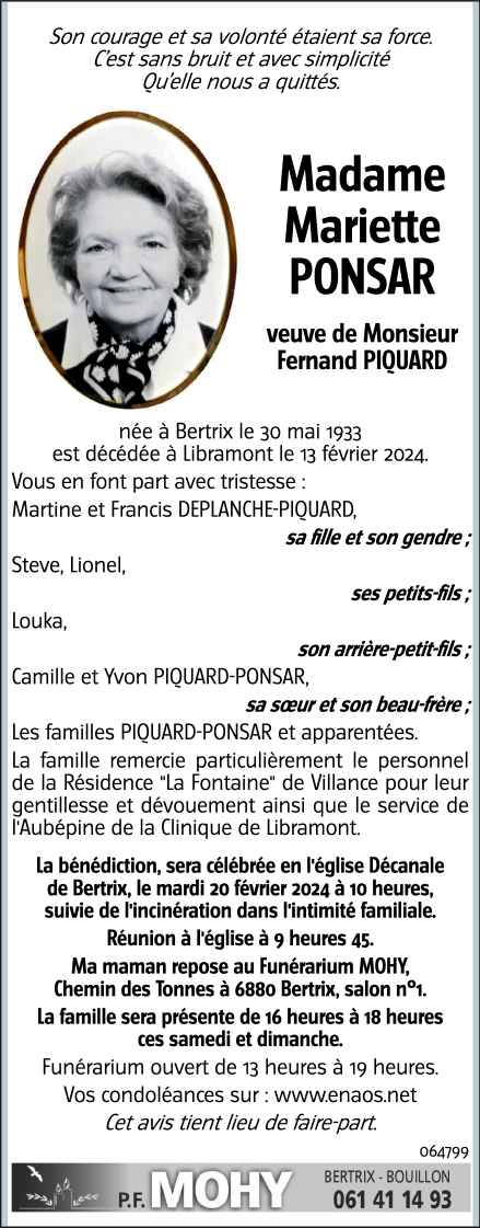 Décédée à Libramont (6800) le mardi 13 février 2024 à l'âge de 90 ans