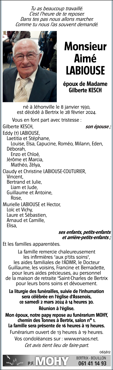 Décédé à Bertrix (6880) le mercredi 28 février 2024 à l'âge de 94 ans