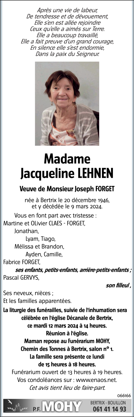 Décédée à Bertrix (6880) le samedi 9 mars 2024 à l'âge de 77 ans