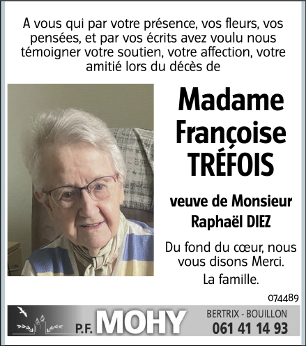 Décédée à Villance (6890) le dimanche 28 juillet 2024 à l'âge de 86 ans