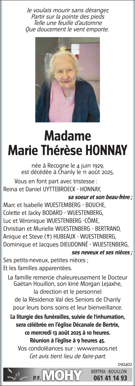Décédée à Chanly (6921) le lundi 11 août 2025 à l'âge de 96 ans