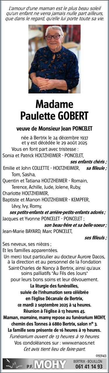 Décédée à Bertrix (6880) le vendredi 29 août 2025 à l'âge de 87 ans