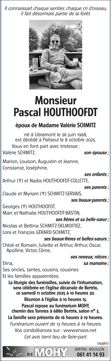 Décédé à Paliseul (6850) le jeudi 9 octobre 2025 à l'âge de 57 ans