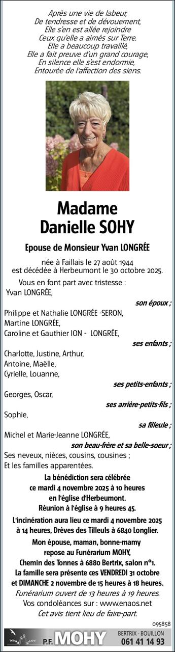 Décédée à Herbeumont (6887) le jeudi 30 octobre 2025 à l'âge de 81 ans