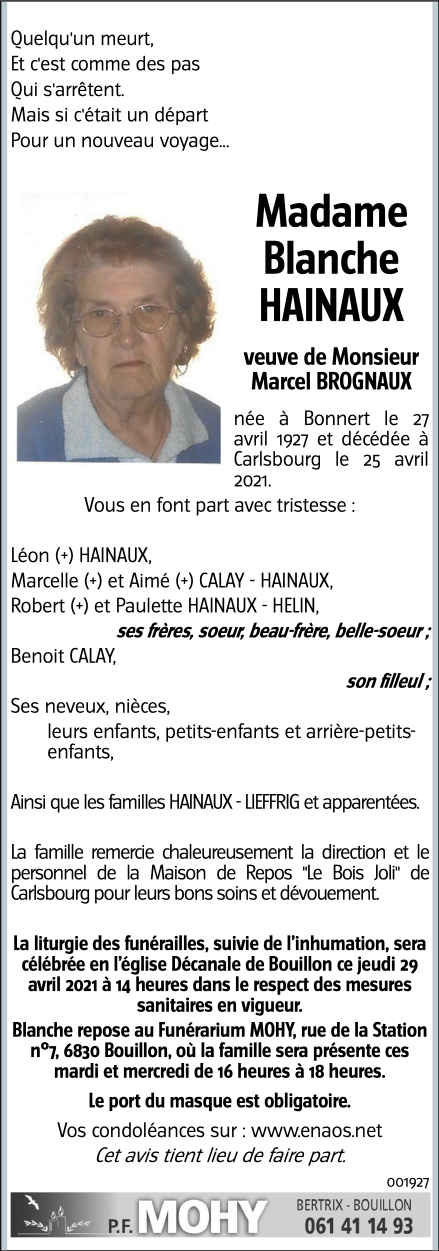 Décédée à Carlsbourg (6850) le dimanche 25 avril 2021 à l'âge de 93 ans