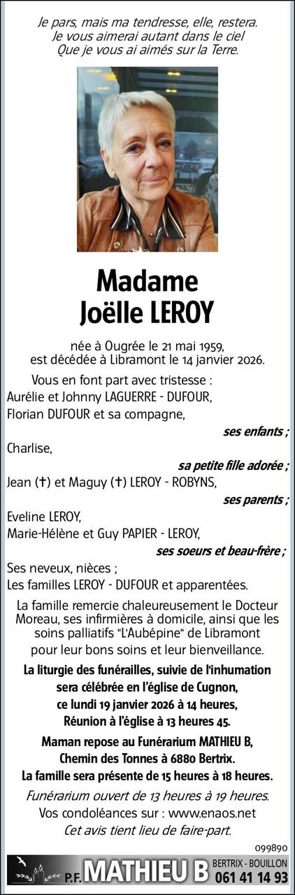 Décédée à Libramont (6800) le vendredi 16 janvier 2026 à l'âge de 66 ans