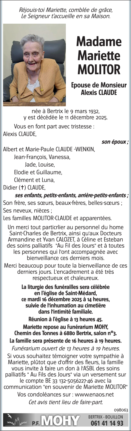 Décédée à Bertrix (6880) le jeudi 11 décembre 2025 à l'âge de 93 ans