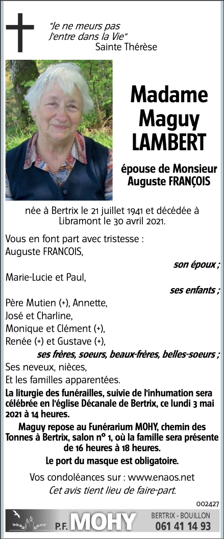 Décédée à Libramont (6800) le vendredi 30 avril 2021 à l'âge de 79 ans
