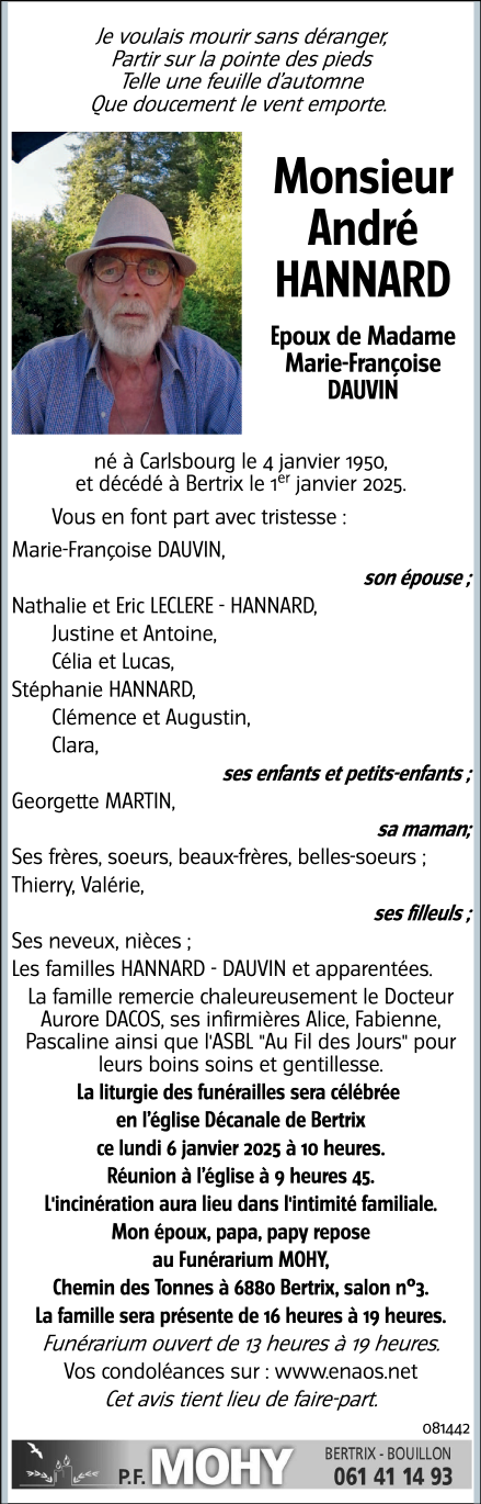 Décédé à Bertrix (6880) le mercredi 1 janvier 2025 à l'âge de 74 ans