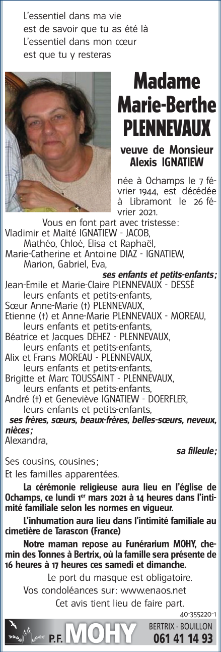 Décédée à Libramont (6800) le vendredi 26 février 2021 à l'âge de 77 ans