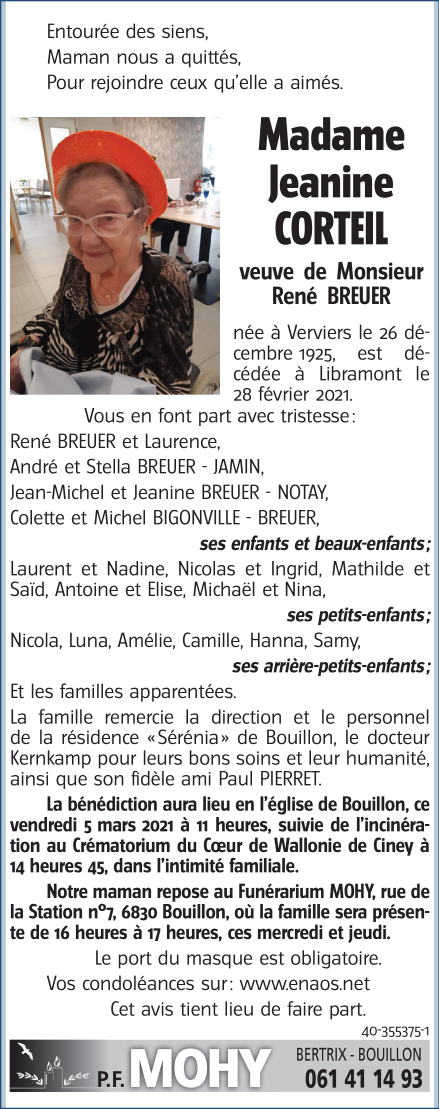 Décédée à Libramont (6800) le dimanche 28 février 2021 à l'âge de 95 ans