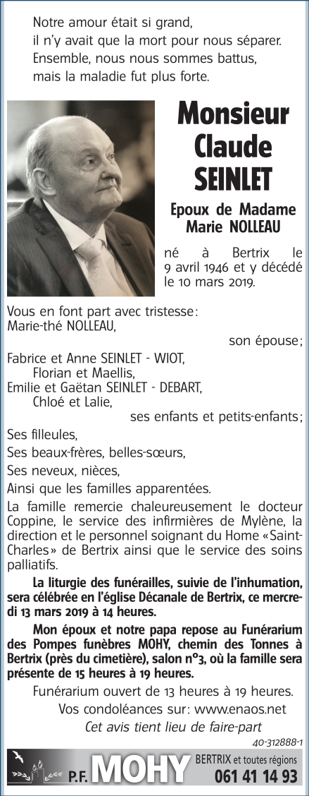 Décédé à Bertrix (6880) le dimanche 10 mars 2019 à l'âge de 72 ans