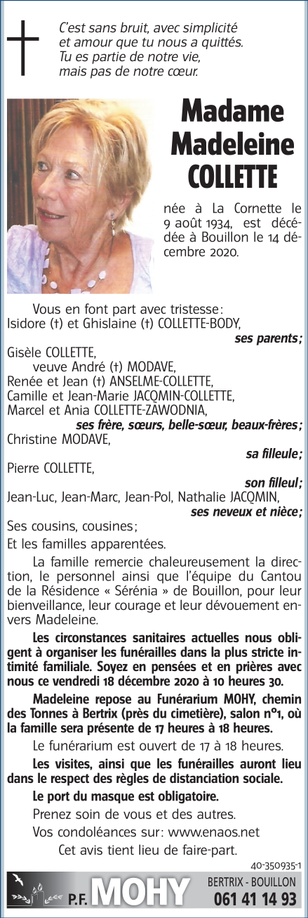 Décédée à Bouillon (6830) le lundi 14 décembre 2020 à l'âge de 86 ans