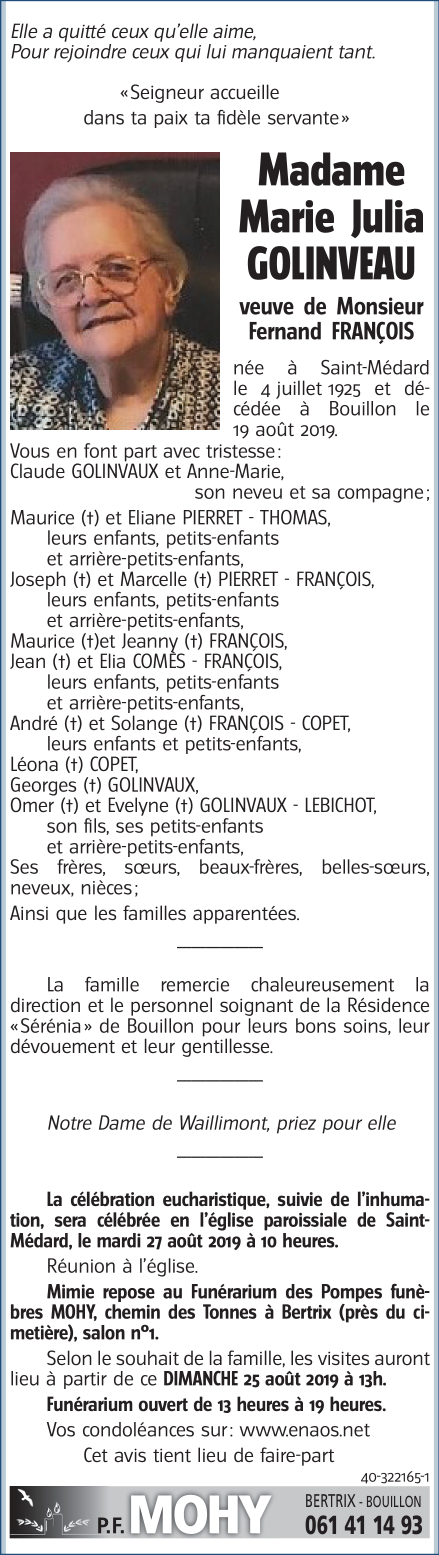 Décédée à Bouillon (6830) le lundi 19 août 2019 à l'âge de 94 ans