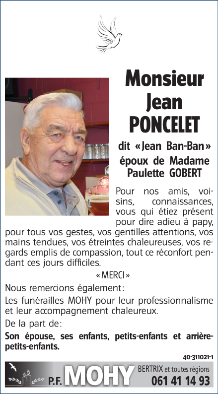 Décédé à Bertrix (6880) le samedi 26 janvier 2019 à l'âge de 84 ans