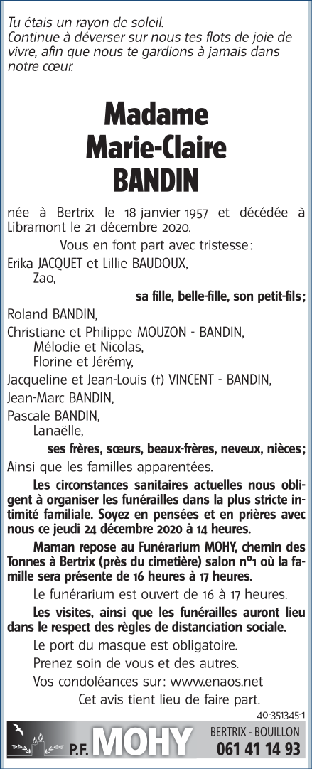 Décédée à Libramont (6800) le lundi 21 décembre 2020 à l'âge de 63 ans