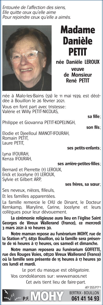 Décédée à Bouillon (6830) le vendredi 26 février 2021 à l'âge de 81 ans