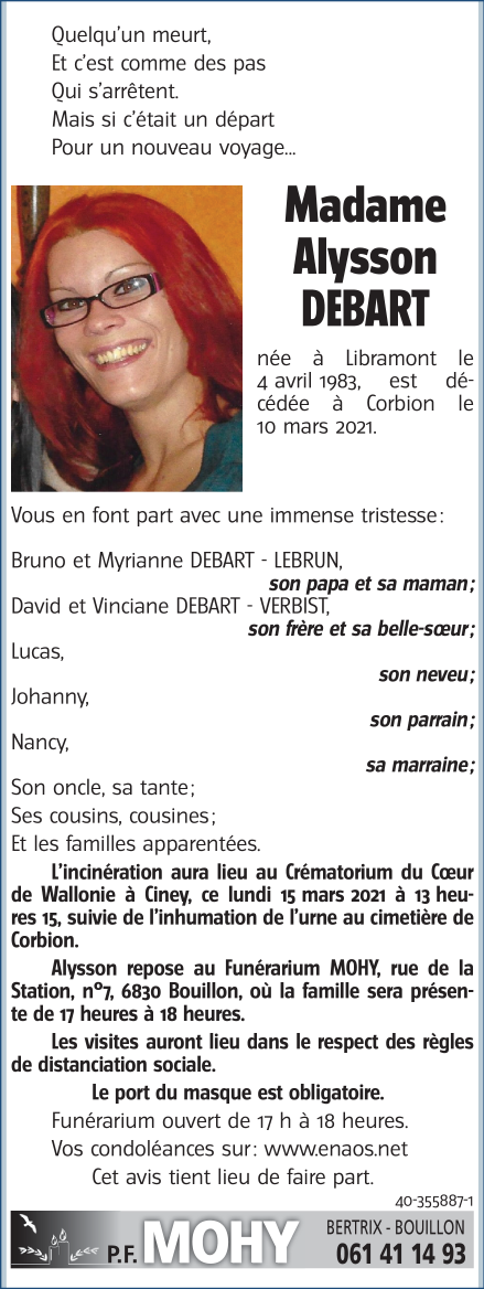 Décédée à Corbion (6838) le mercredi 10 mars 2021 à l'âge de 37 ans