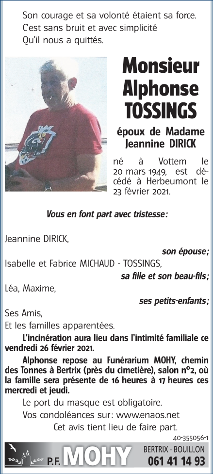 Décédé à Herbeumont (6887) le mardi 23 février 2021 à l'âge de 71 ans