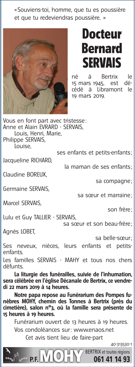 Décédé à Libramont (6800) le mardi 19 mars 2019 à l'âge de 74 ans