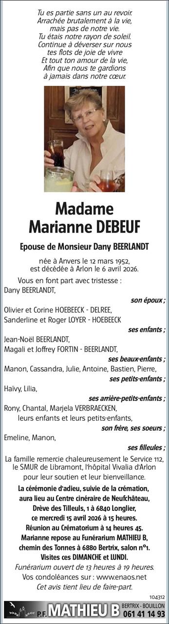 Décédée à Arlon (6700) le mercredi 8 avril 2026 à l'âge de 74 ans