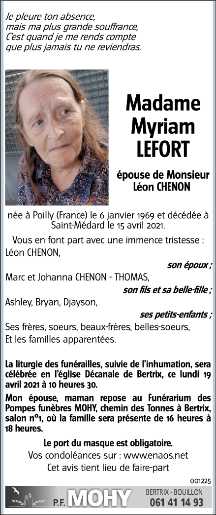 Décédée à Saint-Médard (6887) le jeudi 15 avril 2021 à l'âge de 52 ans