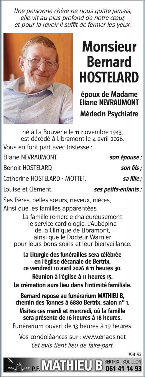 Décédé à Libramont (6800) le lundi 6 avril 2026 à l'âge de 82 ans