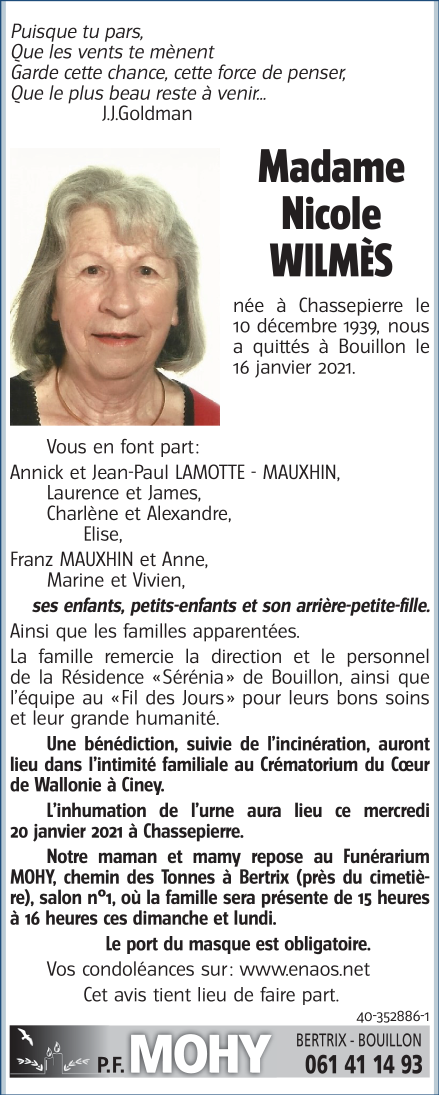 Décédée à Bouillon (6830) le samedi 16 janvier 2021 à l'âge de 81 ans
