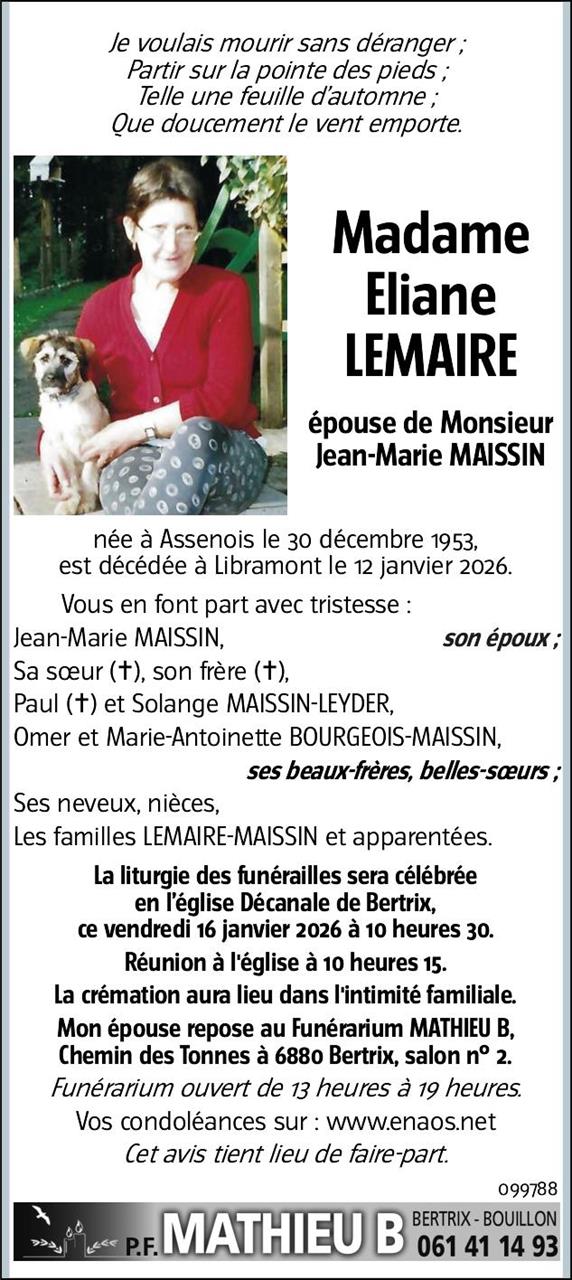 Décédée à Libramont (6800) le mardi 13 janvier 2026 à l'âge de 72 ans